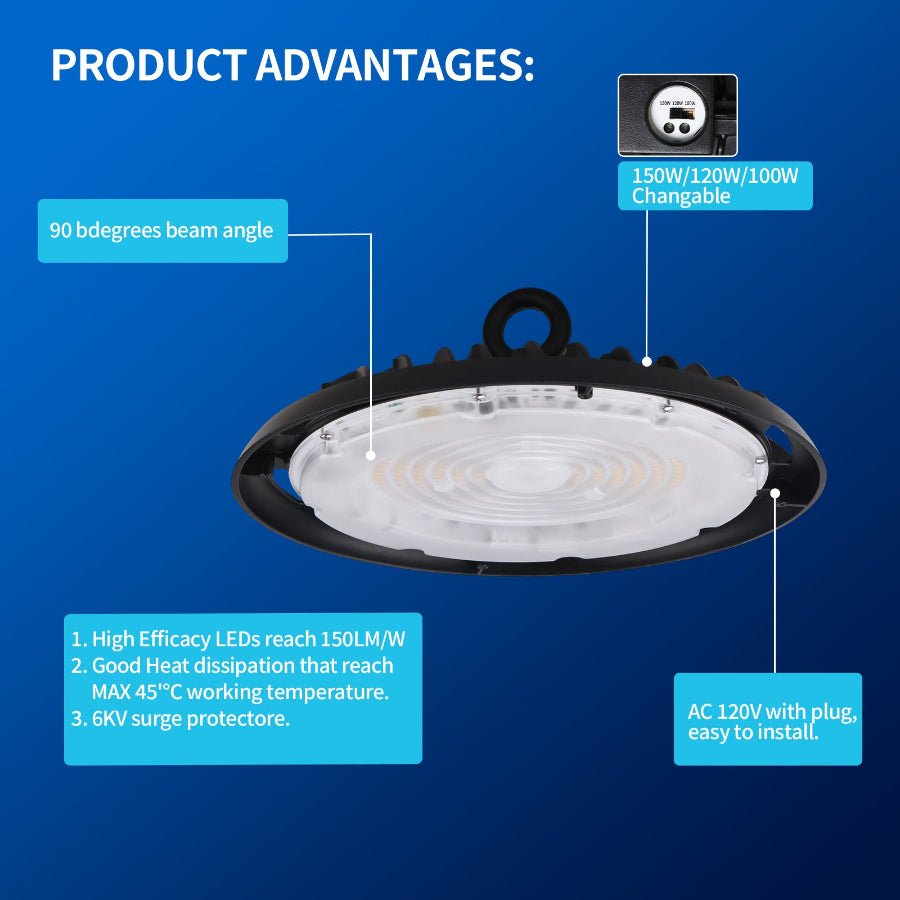 UFO LED High Bay Light, 150W/120W/100W Changeable, Plug & Play Lighting For Warehouse, 22500 Lumens, 5700K Cool White, UL&CUL Listed, 90 Degree Beam Angle, AC120V With 6' Power Cord Included