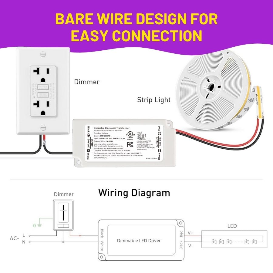 Built-in safety protections—against short circuits, overloads, and overheating—enhance the durability and longevity of your lighting setup. Its minimal size (3.31" × 1.57" × 0.98") and bare wire connection design make installation easy and space-saving, even in compact enclosures. Ideal for LED strip lights, low voltage modules, and other 12V lighting applications, this LED driver is UL Listed, Class P certified, and backed by a 3-year manufacturer warranty from Patel LED. Use it confidently in both dry and damp locations for professional-grade results.
