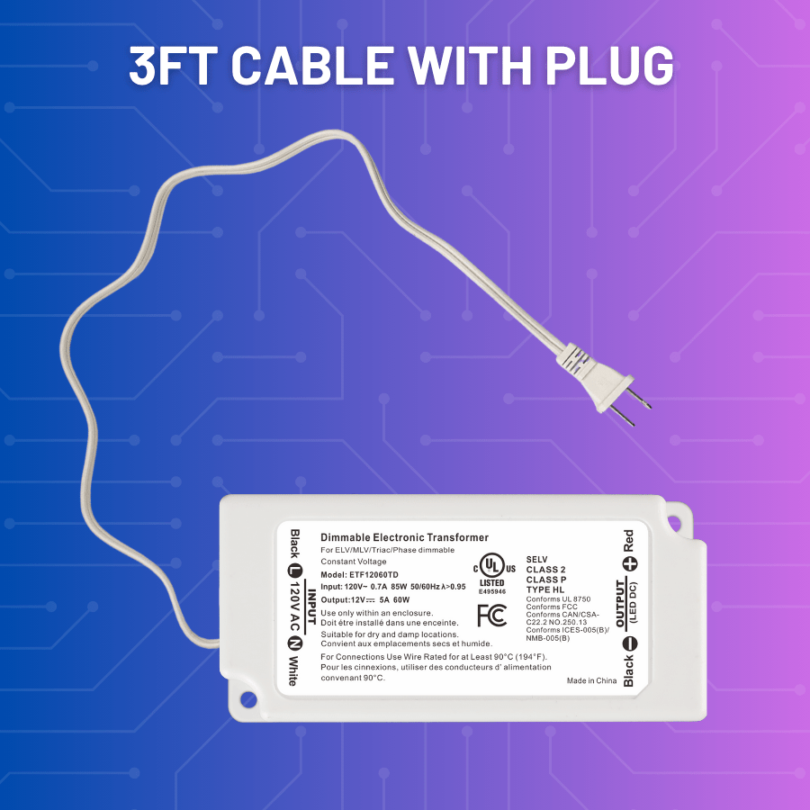 The 60W Dimmable LED Driver is a compact, high-efficiency power supply designed to convert 120V AC to a stable 12V DC output—perfect for low voltage LED lighting systems. This electronic transformer offers seamless compatibility with popular TRIAC, ELV, and MLV dimmer switches from trusted brands like Lutron and Leviton. It delivers flicker-free, 0-100% smooth dimming performance with no delay, pop-on, or pop-off effects, ensuring a reliable and aesthetic lighting experience.