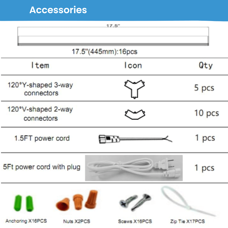 | Included Components | Connector, Light Tubes, Pronged Power Cord, Power Cable, Anchoring, Nuts, Screws |
