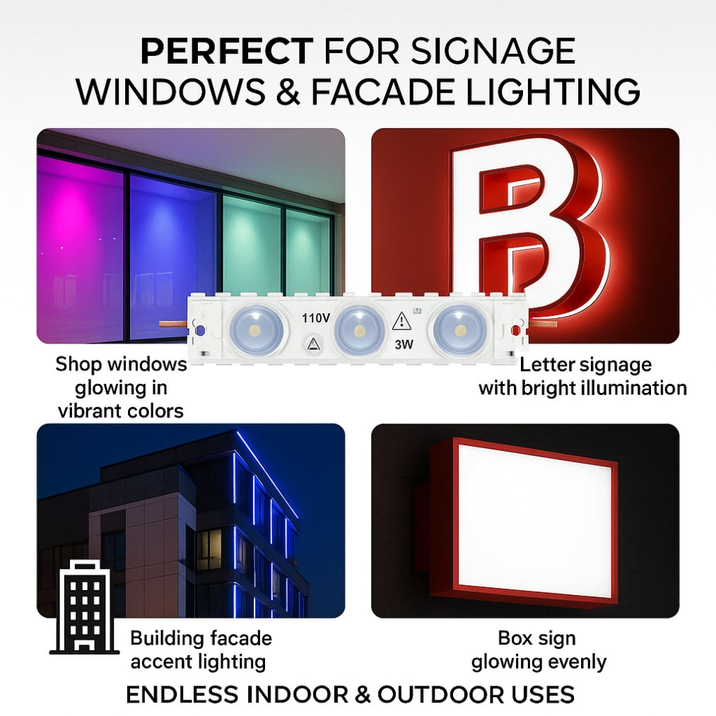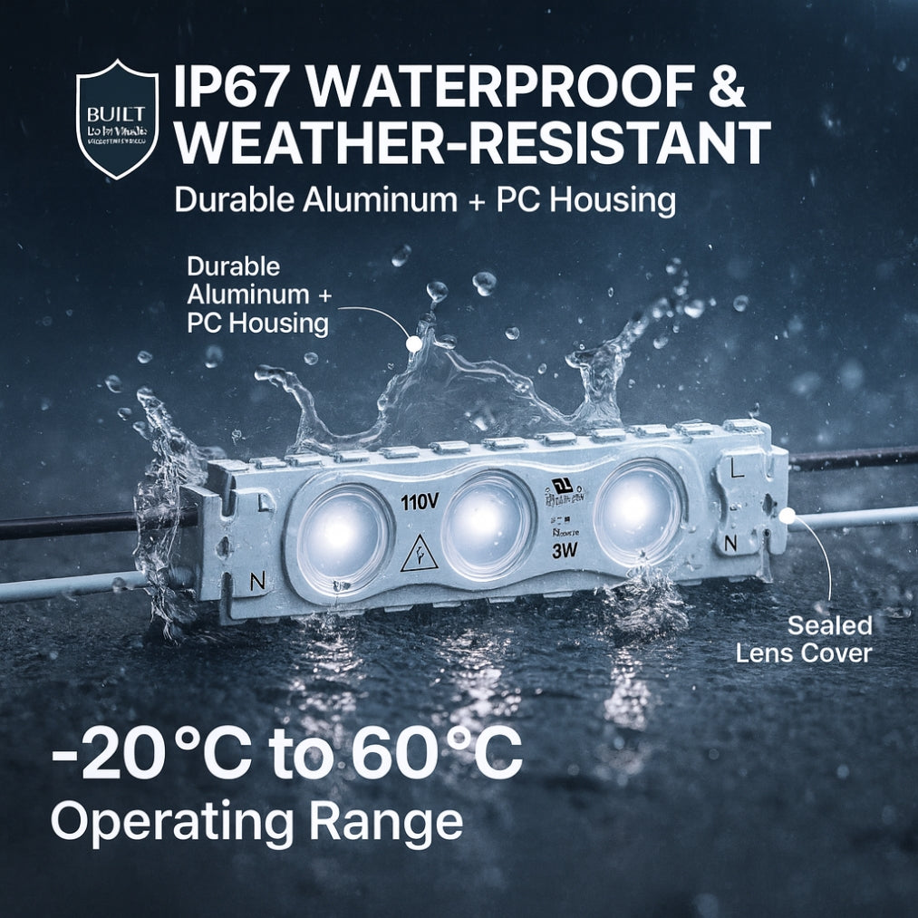 Built with a durable aluminum and PC housing, this module is IP67 waterproof rated, ensuring protection against dust and moisture for reliable performance in both indoor and outdoor environments. With UL certification, a 50,000-hour lifespan, and dimmable capability, it offers dependable, flexible, and energy-saving illumination.